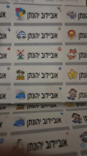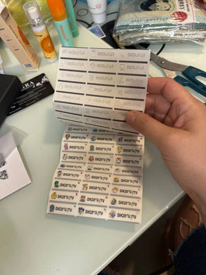 Personalized multilingual labels include Hebrew, English, and Spanish. Clear, readable text avoids mix-ups in class and makes drop-off and pick-up simpler.